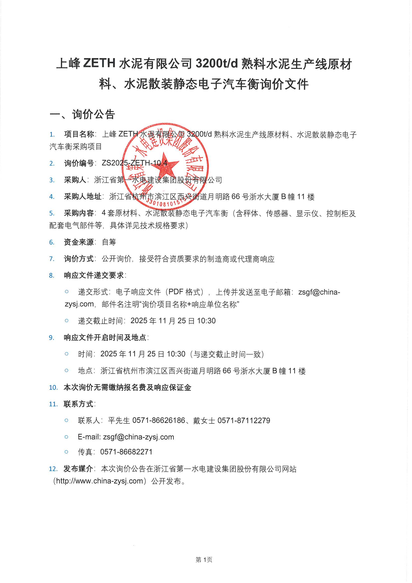 上峰ZETH水泥有限公司3200t/d熟料水泥生產(chǎn)線原材料、水泥散裝靜態(tài)電子汽車衡詢價(jià)公告